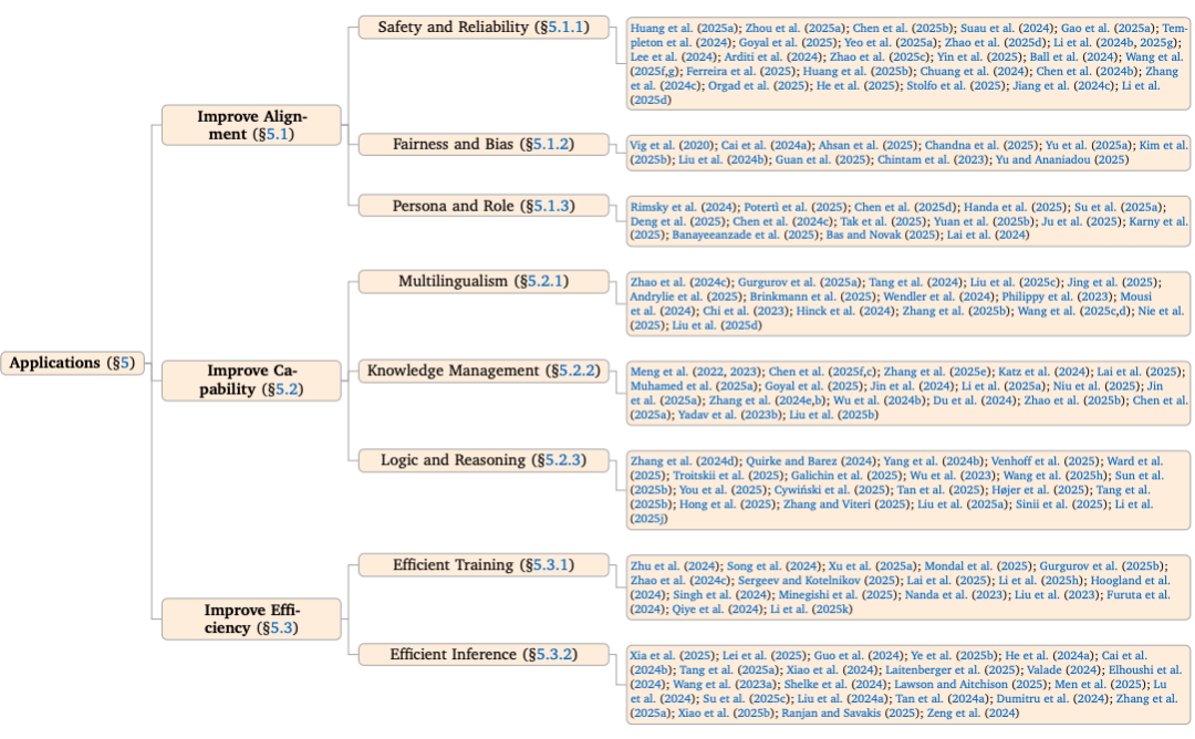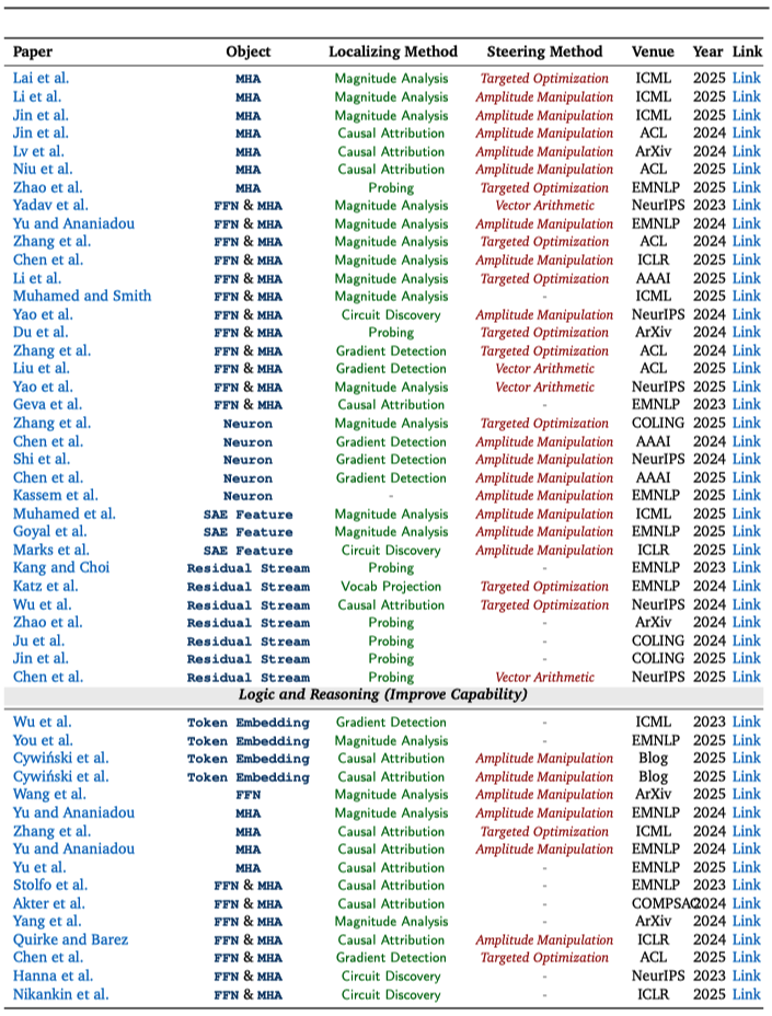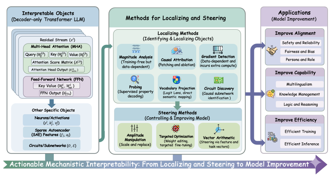 正是基于这一问题,研究团队撰写了这篇以实践为导向的系统性综述。不同于传统综述侧重于回答 “模型内部有什么”,本文将关注点转向 “可以对模型做什么”,并围绕 "定位->操控->提升" 这一闭环,系统梳理了机制可解释性如何走向可实践的模型改造路径。