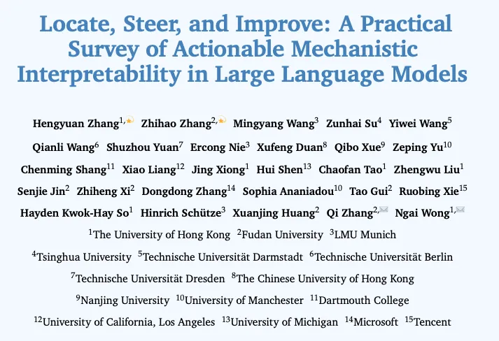 正是在这一背景下,来自香港大学、复旦大学、慕尼黑大学、曼切斯特大学、腾讯等机构的研究团队联合发布了 “可实践的机制可解释性”(Actionable Mechanistic Interpretability)综述。文章通过 "Locate, Steer, and Improve" 的三阶段范式,系统梳理了如何将 MI 从 “显微镜” 转化为 “手术刀”,为大模型的对齐、能力增强和效率提升提供了一套具体的方法论。