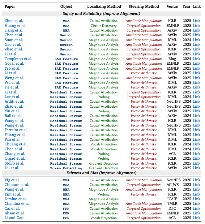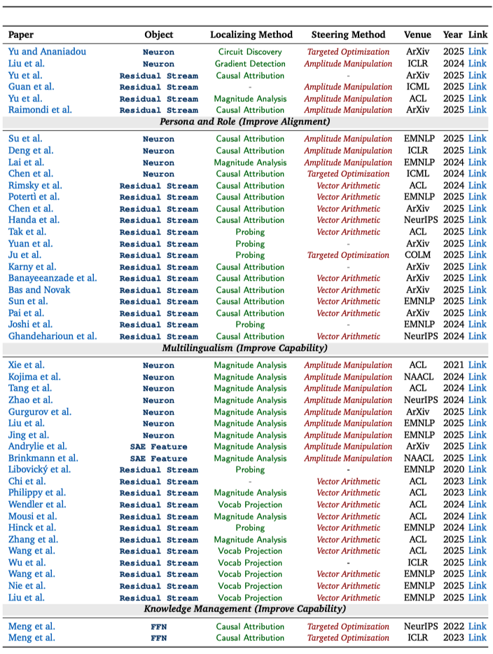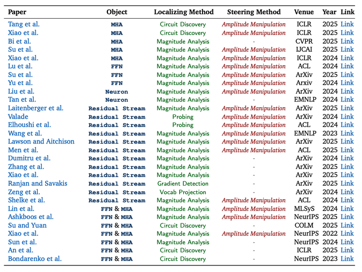 对相似领域的可解释性工作,研究团队将分散的研究成果做成了 “可检索的图表”:每篇论文都用统一标签标出它在研究什么、怎么找到关键位置、以及如何进一步用来引导模型行为,以便将不同研究路线的代表性工作进行直观对照,快速定位与自身需求最契合的的关键论文。