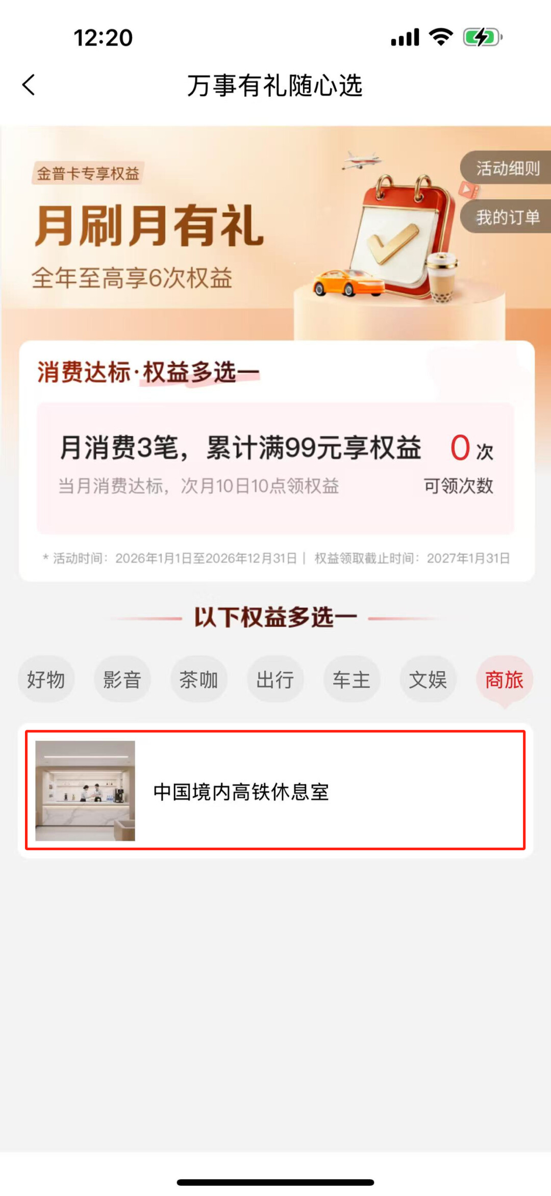 更推荐商旅里的高铁休息室,全年可以累计领6次,说难听点,有些银行的高端白金卡送的都没这么多。