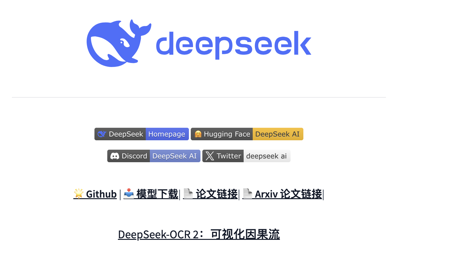 DeepSeek 发布 OCR 2,采用 DeepEncoder V2 方法,视觉编码更智能,模型、代码和技术报告已开源。