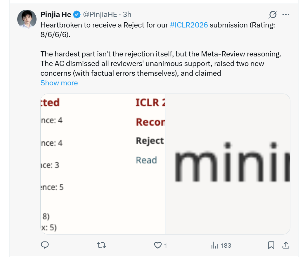 这位网友则表示,在评分分别为 8 / 6 / 6 / 6、且评审意见整体偏正面的情况下,论文仍被拒稿。最让人难以接受的并不是拒稿本身,而是 Meta-Review 给出的理由。AC 无视了所有评审的一致支持,额外提出了两个新的质疑(而且这些质疑本身还存在事实性错误),并声称:所有评审意见都较为表面(尽管勉强高于评审的最低要求门槛)。