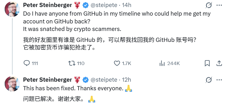 在重命名过程中,GitHub 平台出现故障,导致 Peter 的个人账号一度报错。更糟糕的是,在其 X 账户重命名的短短 10 秒内,旧 ID「@clawdbot」便被加密货币骗子迅速抢注。