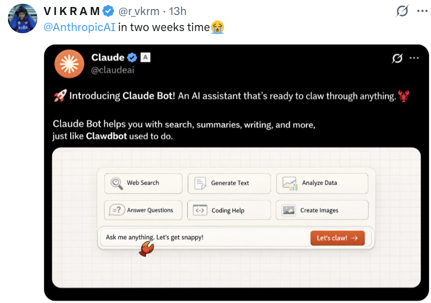 更有网友调侃,Anthropic 如此急于收回名称主权,或许是因为他们计划在两周内推出自己的官方版「Claude Bot」。