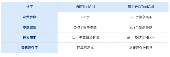 为什么我们的场景更复杂?在租赁场景中,一次成功的推荐需要多次工具调用(涉及几十个工具参数)。相比通用场景,我们的业务对toolcall精度要求极高。