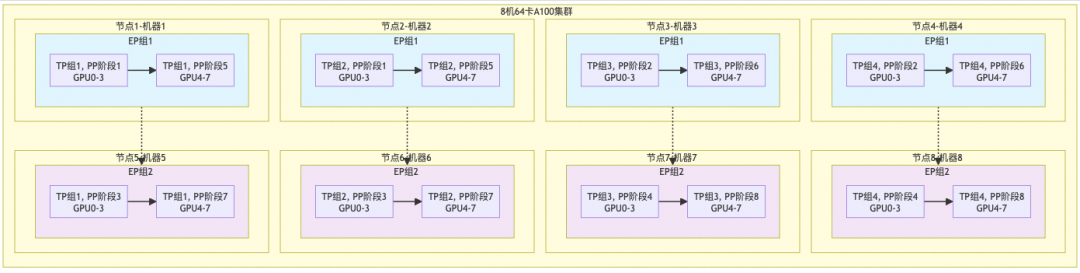 为了解决这些问题,我们引入并精细调优了Megatron的6维并行训练策略(TP+PP+DP+SP+CP+EP)。举例,在一个包含8机64卡A100的集群中,我们将并行策略配置为TP=4, PP=8, EP=2, DP=1,成功地将计算和通信负载均匀地分布到整个集群。一个“热门专家”的计算,首先被TP=4拆分成4份,然后它所在的专家组可能被EP=2拆到2个不同的GPU节点,最后这些计算又嵌入在PP=8的流水线阶段中。这样,一个原本可能压垮单个GPU的热点,被成功分解成了多个可管理的小任务,分布到多个计算单元。通过上述组合,几乎集群中的每一张GPU都被赋予了明确的计算任务(要么是TP的一部分,要么是PP的一个阶段,要么是EP的一个专家子集),计算和通信很自然地达到了一个平衡状态。