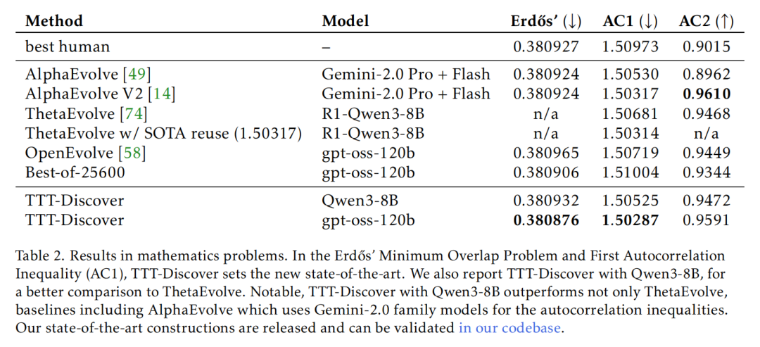 可以看到,在数学领域,关于构造数学对象(如阶跃函数)来证明不等式的更紧致边界 ——Erdős 最小重叠问题任务上,之前人类最佳表现是 0.380927、AI 最佳表现 (AlphaEvolve) 是 0.380924,而 TTT-Discover 刷新记录,拿到了 0.380876 的成绩。