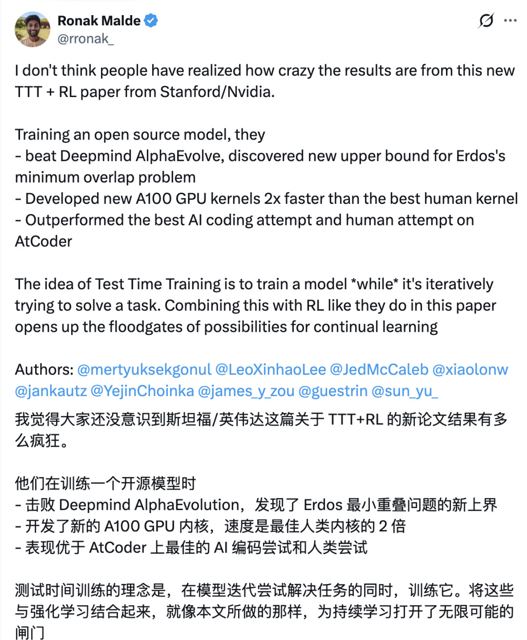 斯坦福、英伟达提出TTT-Discover,一种测试时强化学习方法,部分任务超越人类专家2倍,或为持续学习带来新思路。
