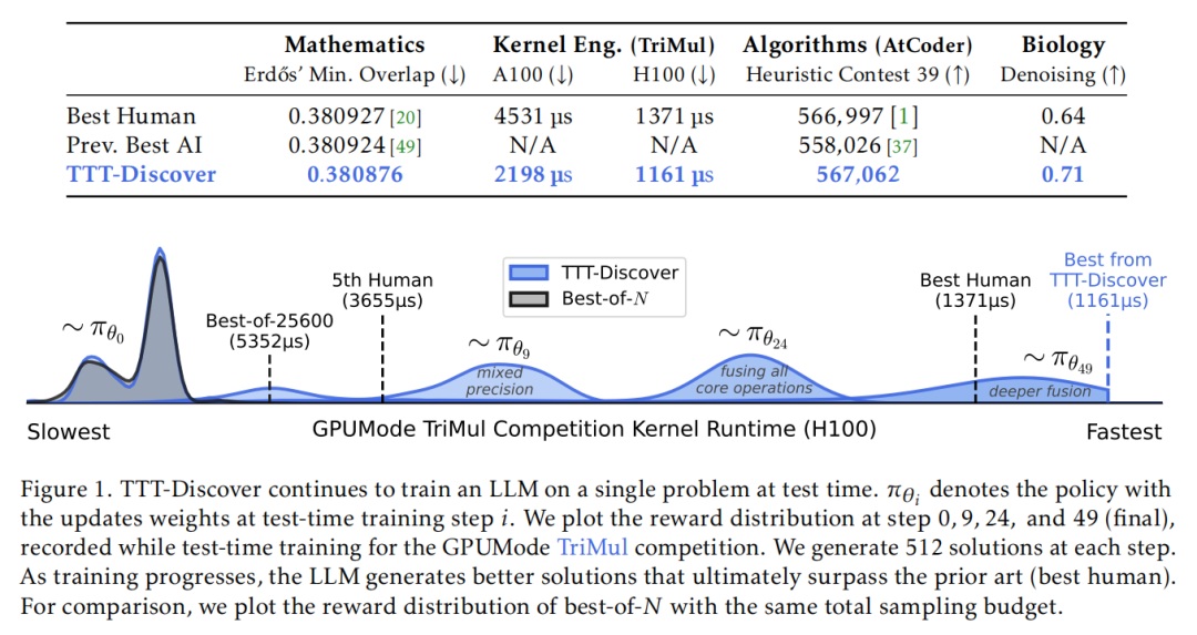 下图展示了 TTT-Discover 的核心机制,展示 TTT-Discover 在测试阶段针对单个问题持续对大语言模型(LLM)进行训练,记 πθi 为在测试时训练第 i 步更新权重后的策略。该图绘制的是 TTT-Discover 在 GPUMode TriMul 竞赛中测试时,第 0 步、第 9 步、第 24 步以及第 49 步(最终阶段)的奖励分布情况,每一步都会生成 512 个候选解。