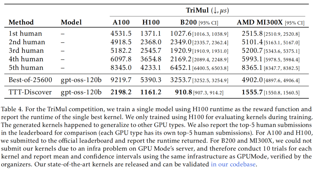结果是,团队的 TriMul 内核在所有 GPU 类型上均达到了当前最优水平。在 A100 上,TTT-Discover 找到的最佳内核比人类专家提交的最优方案快 50%,尽管在训练阶段团队的奖励函数并未在 A100 上直接计时。总体而言,在所有 GPU 类型上,该方法都相对于人类最佳结果实现了超过 15% 的性能提升。