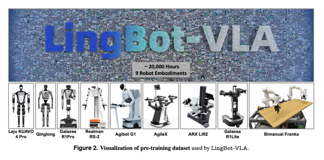 LingBot-VLA 的强泛化能力,本质上来源于其对海量跨本体数据的有效利用。这个模型所用的 20000 小时真机数据,来自 9 个不同的机器人平台。传统上,由于不同机器人之间的传感器、控制接口、本体结构差异巨大,这些数据是很难被统一利用的,而 LingBot-VLA 打破了这一瓶颈。