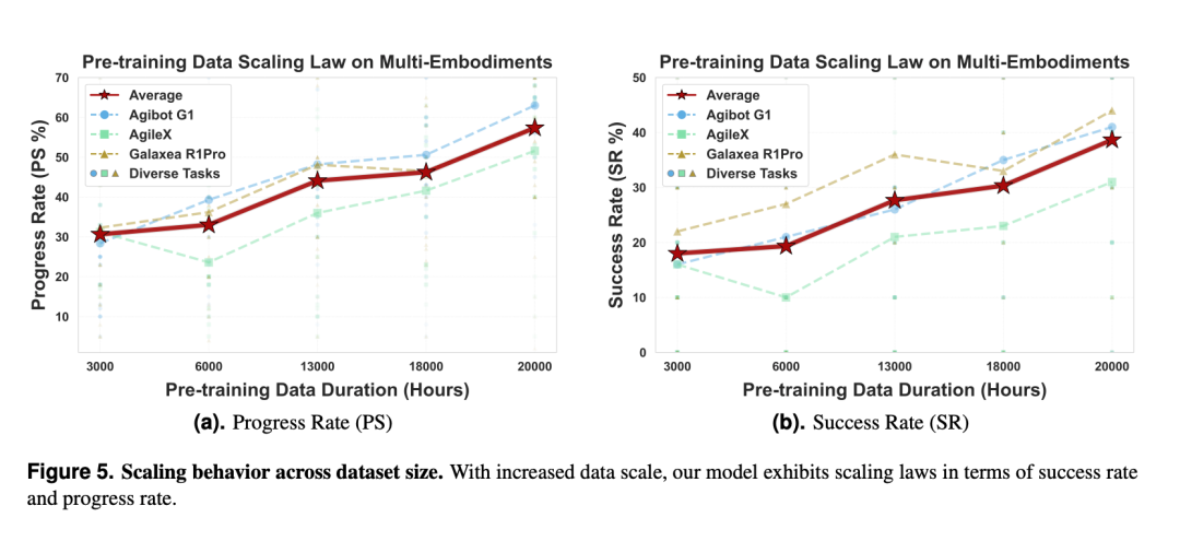 蚂蚁灵波在技术报告中首次系统性地揭示了 VLA 模型在真实机器人数据上的 Scaling Law:随着预训练数据规模从 3000 小时逐步扩展至 20000 小时,模型在下游任务的成功率获得了持续且显著的提升。尤为关键的是,即使达到 20000 小时这一量级,模型性能曲线仍未显示饱和迹象。这一发现为行业点亮了一座灯塔,用数据证实了「大力出奇迹」的路径在真实机器人学习中依然有效,为后续的大规模数据开发指明了可预期的回报。