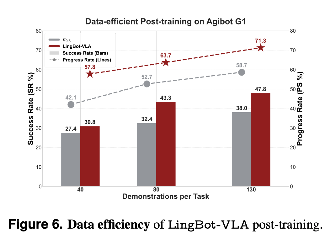 实验显示,在 Agibot G1 平台上,仅使用 80 条示范数据进行后训练,LingBot-VLA 的表现就超越了使用 130 条完整数据训练的 Pi0.5 模型。而且,当数据量逐步增加时,LingBot-VLA 与 Pi0.5 的性能差距进一步拉大,这从侧面印证了其模型架构在学习潜能和泛化可扩展性上的设计优势。