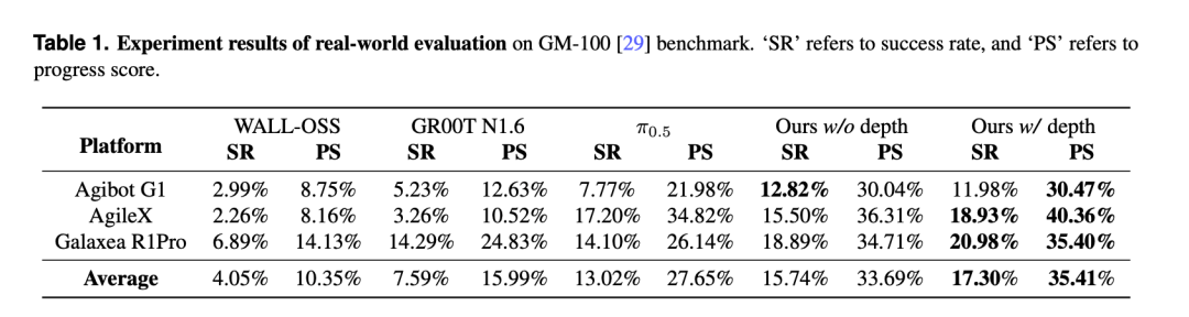 实验结果显示,无论在哪个平台上,LingBot-VLA 的成功率(SR)和部分成功率(PS,子步骤完成情况)都是最高的。尤其在融入基于深度的空间信息后,模型优势更加明显 —— 相比 Pi0.5 平均 SR 提高了 4.28%,PS 提高了 7.76%。这说明,无论是在复杂长序列任务的执行精度上,还是在面对新任务的适应能力上,LingBot-VLA 都展现出了更胜一筹的智能水平。