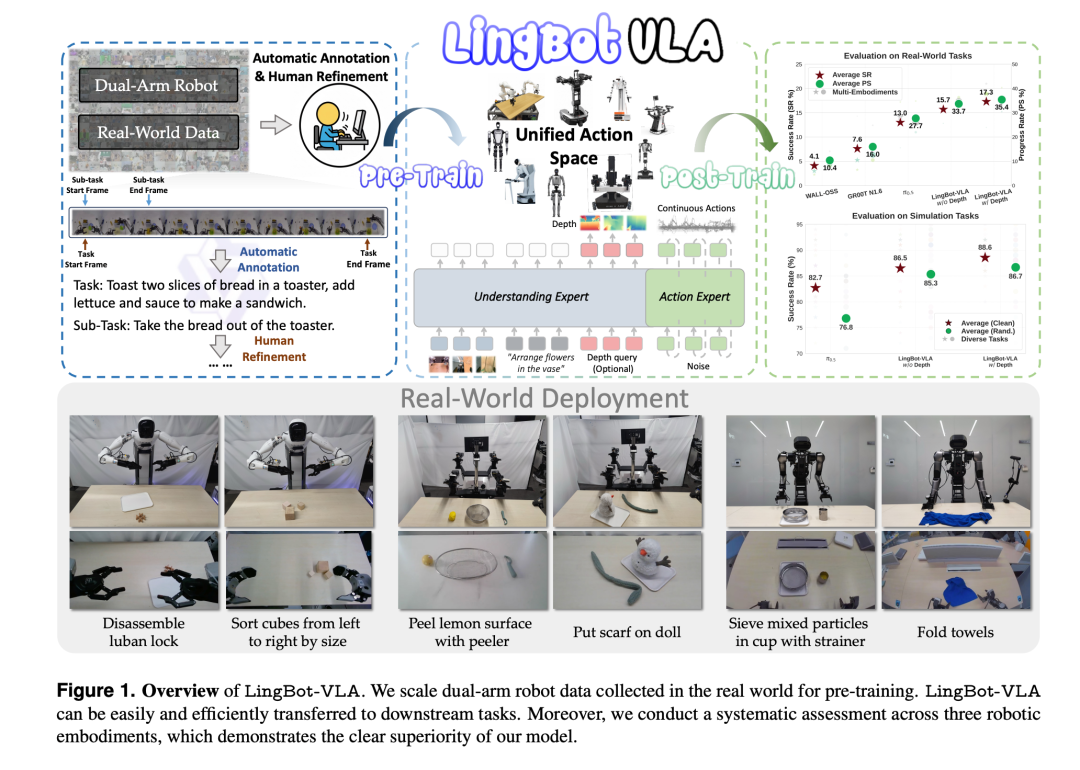 LingBot-VLA 的突破在于其在模型架构、数据规模和训练效率上的提升: