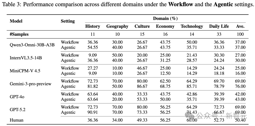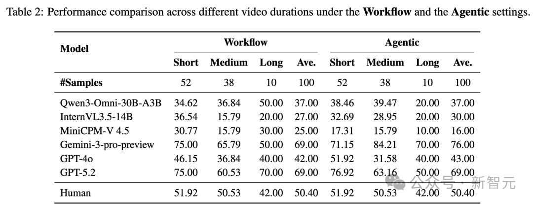 强如Gemini-3在Agentic模式下能利用长上下文获得提升,而部分开源模型在长视频下性能反而大幅下降。