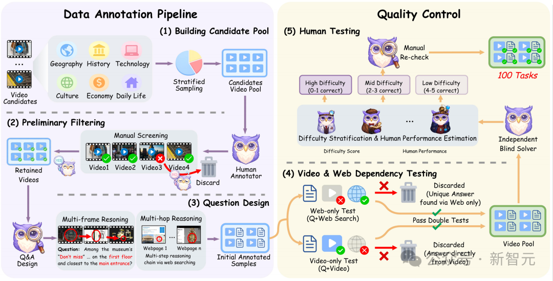 为了保证评测的含金量,VideoDR并没有采用自动化生成,而是进行了严格的人工标注与质检。