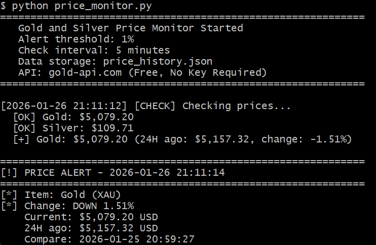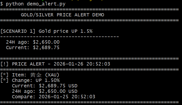 创建一个黄金与白银价格的监控器,当 24 小时内的价格波动超过 1% 时,给我发送通知。
