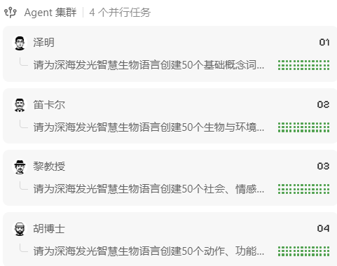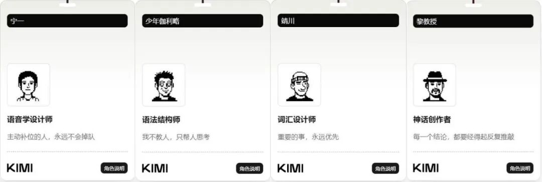 可以看到,任务一开始,Kimi 创建了四个不同的智能体:语音学设计师宁一、语法结构师少年伽利略、词汇设计师靖川和神话创作者黎教授。