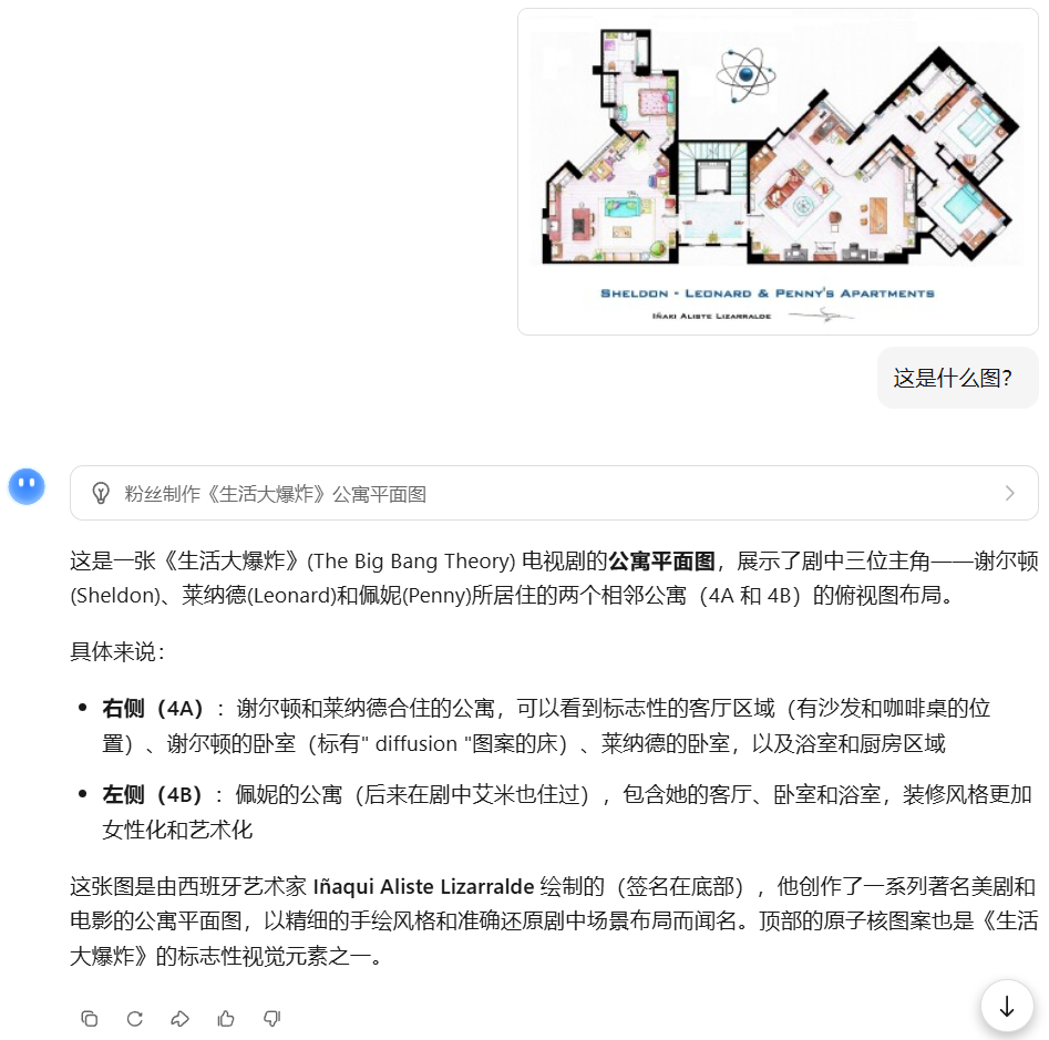 这里我们找到了西班牙室内设计师 Iñaki Aliste Lizarralde 手绘的一张《生活大爆炸》谢尔顿公寓的平面图,先来一个基本考验,看看它能否正确识别这张图的背景: