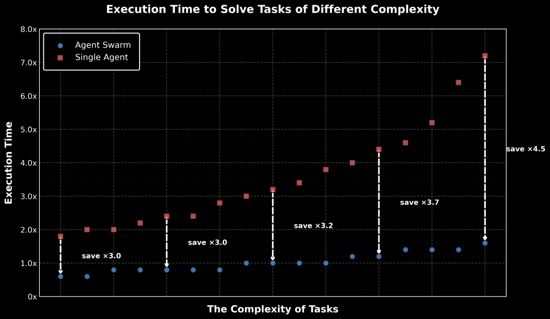 在处理复杂任务时,K2.5 不再是单线程执行任务,而是以指挥者的身份现场调度并协同最多达 100 个 Agent 分身并行工作,最多支持 1500 次工具调用,速度比单智能体的配置还要快 4.5 倍。