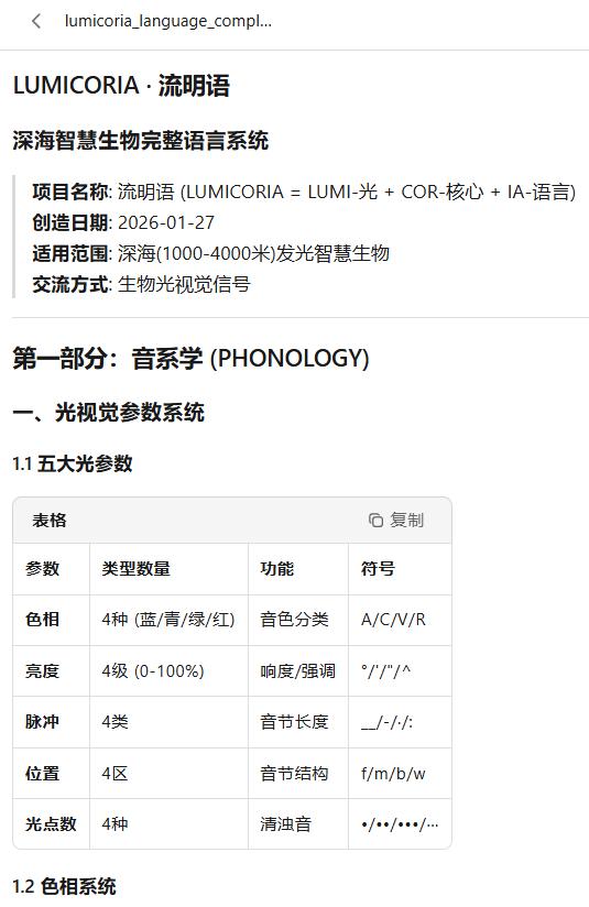 请为一种「生活在深海、通过皮肤发光交流」的智慧生物开发一套基础词汇表。要求包含语法结构、200 个基础词条、以及 3 篇该物种的创世神话。要求集群保证所有自造词汇在语音学和语义学上具有高度的内在逻辑一致性。