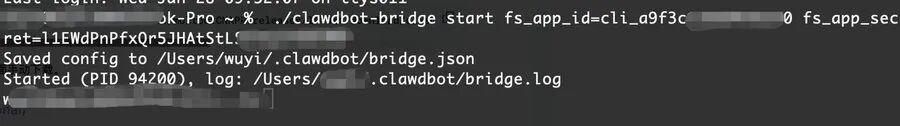 ./clawdbot-bridge start fs_app_id=cli_xxx fs_app_secret=yyy