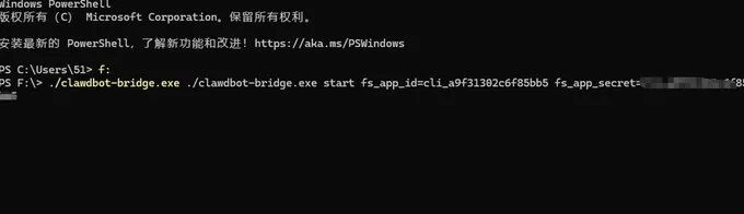 ./clawdbot-bridge.exe start fs_app_id=cli_xxx fs_app_secret=yyy