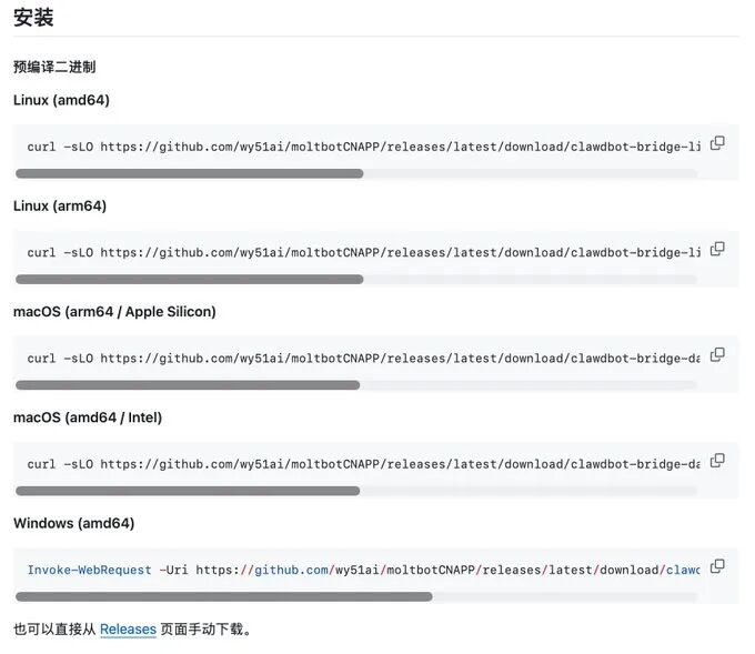 MacOS,Linux 用户,如果有全局梯子,建议直接用命令行下载。如果终端下载失败就从 Release 页面下载,从 Release 页面下载后重命名为 clawdbot-bridge,并通过 chmod +x clawdbot-bridge 给文件权限。