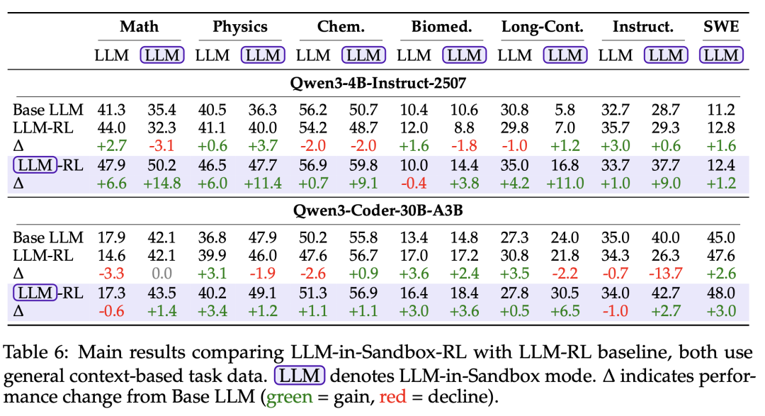 实验在 Qwen3-4B-Instruct 和 Qwen3-Coder-30B-A3B 两个模型上进行。关键发现是 LLM-in-Sandbox RL 展现出强大的泛化能力: