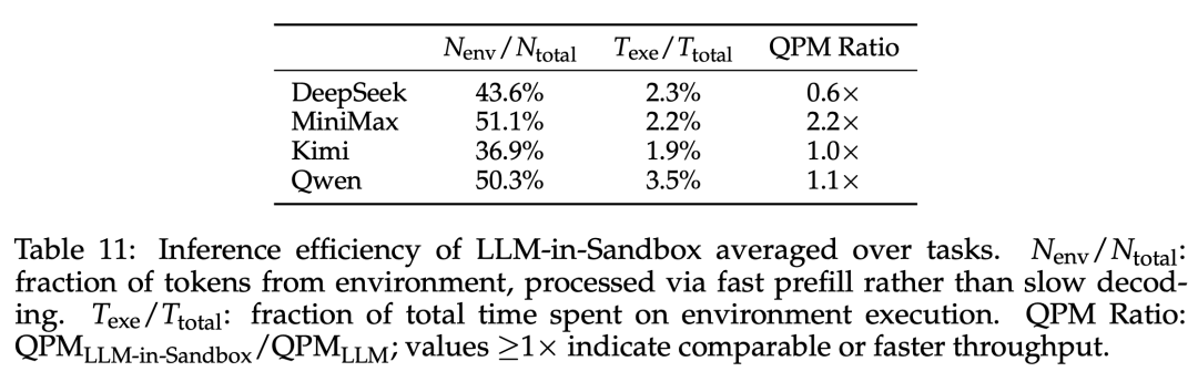 通过将计算卸载到沙盒,LLM-in-Sandbox 将工作负载从慢速的自回归生成(decode)转移到快速的并行预填充(prefill),在平均情况下保持有竞争力的吞吐量(QPM):MiniMax 可实现 2.2 倍加速。