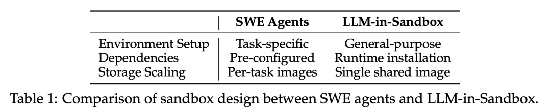 与现有软件工程智能体(SWE-Agent)需要为每个任务配置特定环境不同,LLM-in-Sandbox 采用轻量级、通用化的设计:
