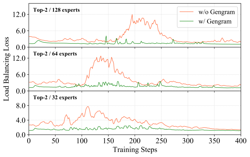 跨稀疏度负载均衡:在 Top-2 / 128、64 和 32 专家配置下,使用与不使用 Gengram 模块的负载均衡损失曲线对比,表明其在多种稀疏度设置下均能实现稳定性能。