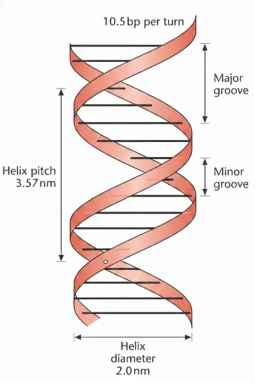 DNA 双螺旋结构示意图展示了 B 型 DNA 的结构参数,DNA 双螺旋每 10.5 个碱基对旋转一圈。