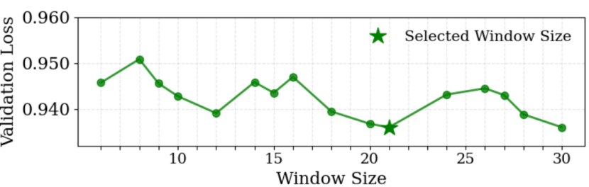 不同 Gengram 窗口大小下的验证损失,由此选择了 21 宽度的窗口