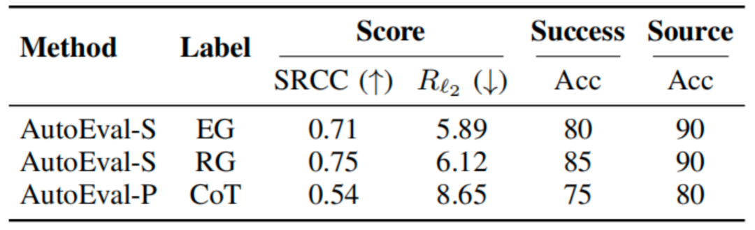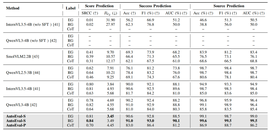 表格 2 Eval-Actions 基准上的性能对比 在专家评分(EG)、排序引导(RG)及思维链(CoT)三种协议下,AutoEval 均取得了 SOTA 性能。特别是在 RG 协议下,AutoEval-S 的评分相关性(SRCC)达到 0.84,来源预测准确率高达 99.6%,远超未微调的 InternVL 和 QwenVL 等基线模型。