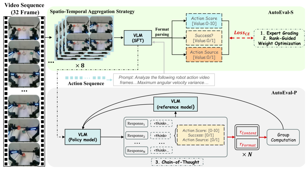 图 3 上分支 (AutoEval-S):专为评分与排序设计。采用时空聚合策略将高频运动细节压缩至视觉 Token,并辅以物理校准信号,精准捕捉动作中的细微抖动。下分支 (AutoEval-P):专为思维链(CoT)推理设计。引入 GRPO 强化学习范式,通过混合奖励函数(内容 + 格式)强制模型生成逻辑自洽的物理推理与评分,有效解决大模型的「幻觉」问题 。