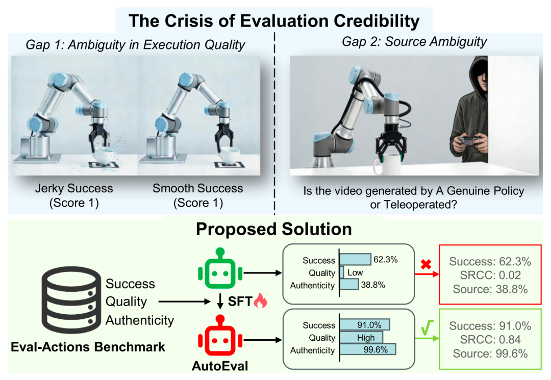 图 1 (上) 评估危机:现有二元指标掩盖了执行质量(如「抖动成功」与「平滑成功」的区别)和来源真实性(难以区分策略生成与人类遥操作)的模糊性。 (下) 解决方案:Eval-Actions 基准与 AutoEval 架构(绿色部分)相结合,填补了这两大空白,实现了精准的细粒度质量评估与鲁棒的来源验证,显著优于传统的通用 VLM(红色部分)。