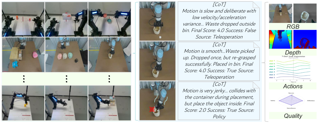 包含失败场景:数据集不仅包含成功的轨迹,还创新性地引入了约 2.8k 条失败数据。这对于模型学习错误恢复和鲁棒的失败检测至关重要 。