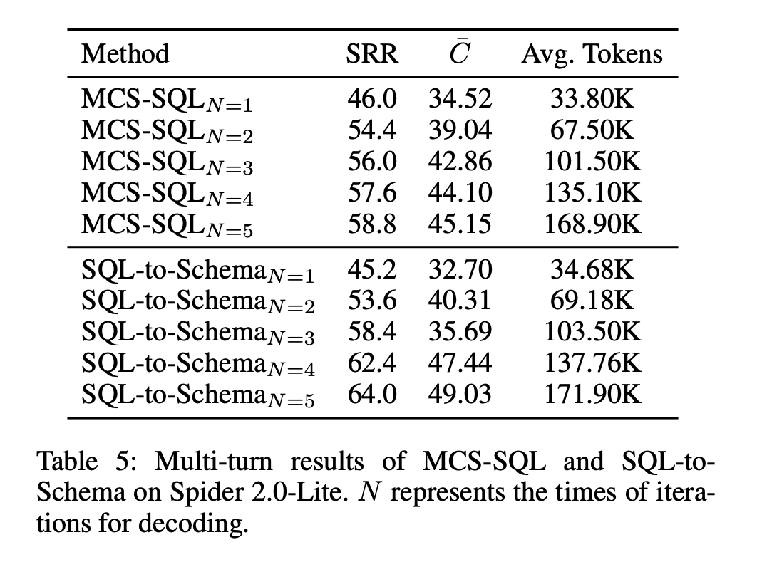 如上表所示,MCS-SQL 和 SQL-to-Schema 方法可以通过多轮 sampling-decoding 来提升 Schema Linking 的召回率。