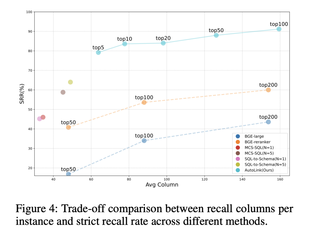 相比之下,AutoLink 在不同数据规模下均保持稳定优势:即便在仅召回少量列的情况下,仍能取得更高的SRR。同时,与 CHESS、LinkAlign 方法不同,AutoLink 并不追求只保留 gold SQL 所需的最少列。
