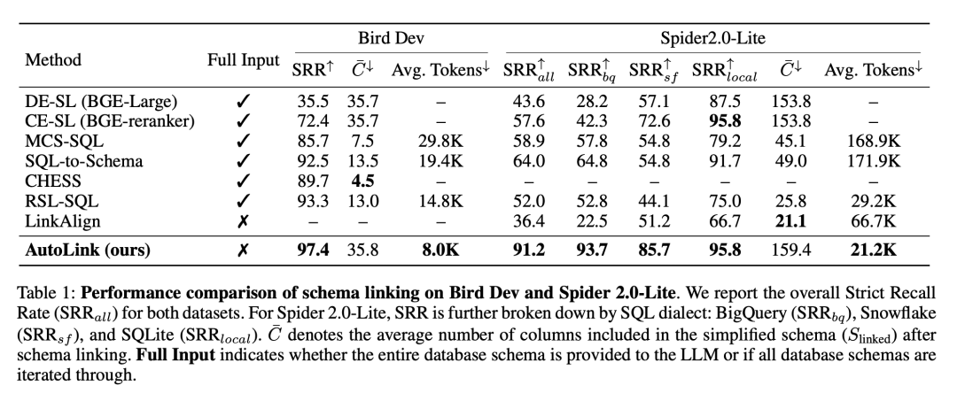 在更具挑战性的 Spider 2.0-Lite 数据集上,AutoLink 的严格召回率(SRR)相比次优方法 SQL-to-Schema 提升了 27.2%,同时将最大 token 消耗降低了 87.7%。