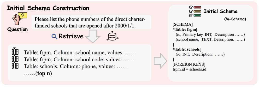 我们使用原始用户问题 作为查询来检索一组初始候选列,从而创建初始模式 ,其中 n 是一个相对较大的超参数(例如 50 或 100),以确保与用户问题高度相关但可能不完整的初始模式元素集。