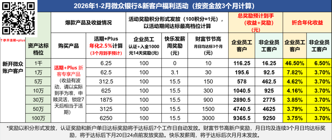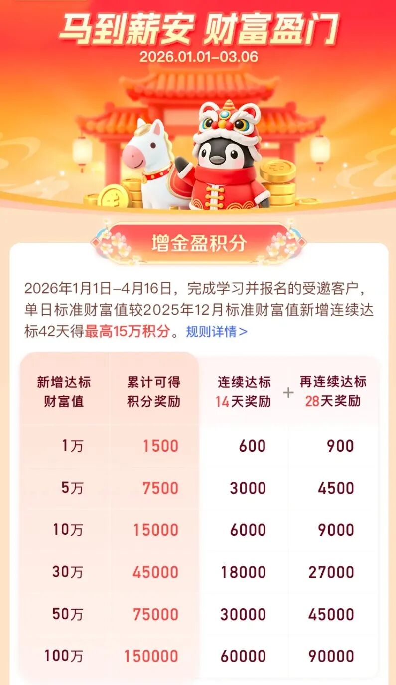老户活动的规则比新户简单,核心是“新增资产达标”。活动时间是2026年1月1日到4月16日,统计的是你2026年1月1日后的资产,比2025年12月的资产新增部分。