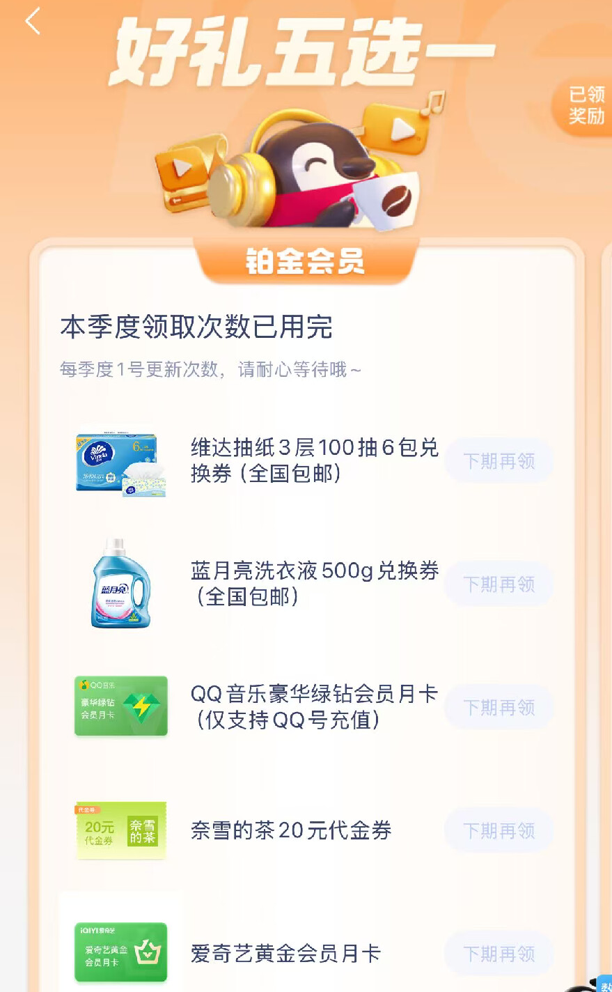 好礼五选一:每季度1次,价值约20元
