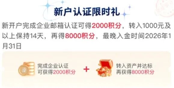 操作很简单:在APP里找到“企业认证”入口,用公司邮箱接收验证码,验证通过后给2000积分(20元);再转入1000元保持14天,又给8000积分(80元),加起来刚好100元。