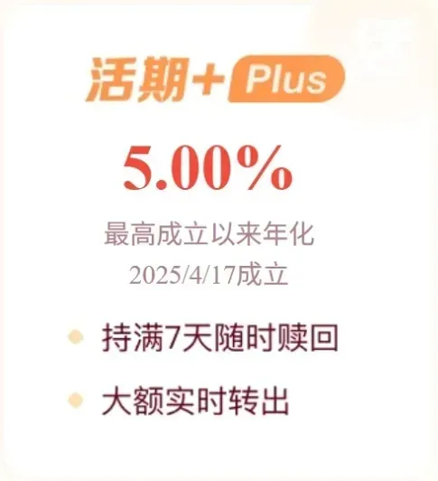 二是理财本身收益能打,“活期+”近七日年化2.91%,“活期+Plus”最高成立以来年化5.0%,比多数银行的活期理财还灵活。