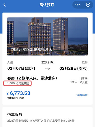 💯 冲刺/保级环球客的最佳时机就是现在,比如在烟台嘉轩,预订每晚送1500分房价,再叠加Q1活动,21晚可得63000分,已经20晚的里程碑奖励2000分,算下来还倒赚1000块,这是要把来回机票也给报了?