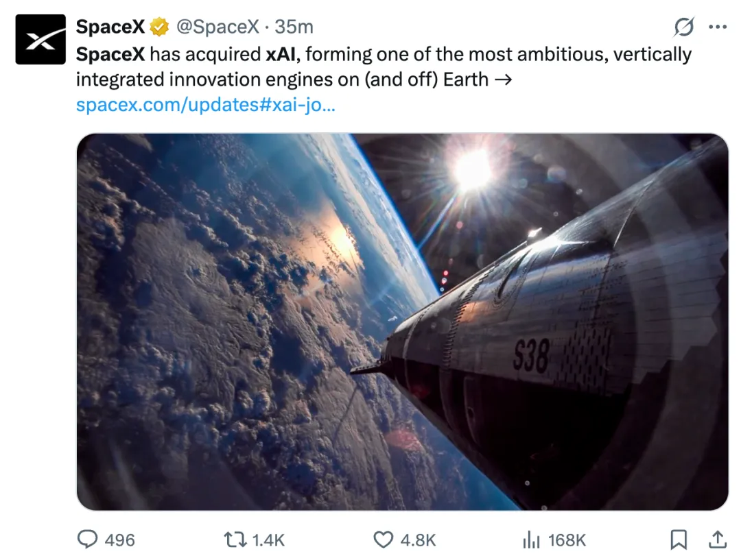 旗下太空探索技术公司与人工智能公司合二为一了。SpaceX 正式宣布收购 xAI!
