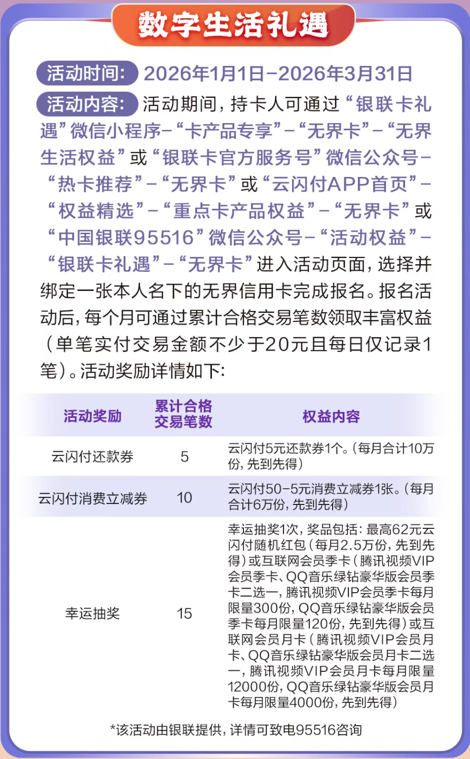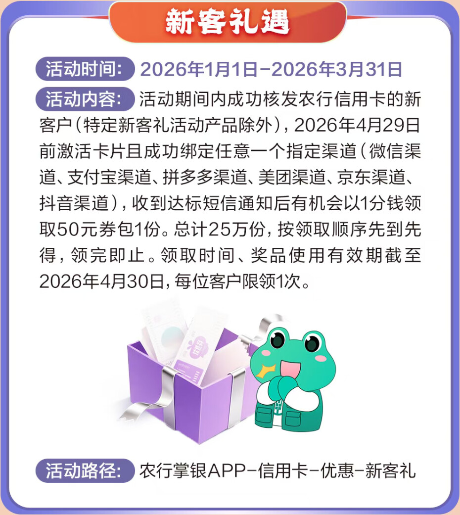 新客户专属礼:2026年一季度新办卡并激活,有机会1分钱抢50元券包,总计25万份。